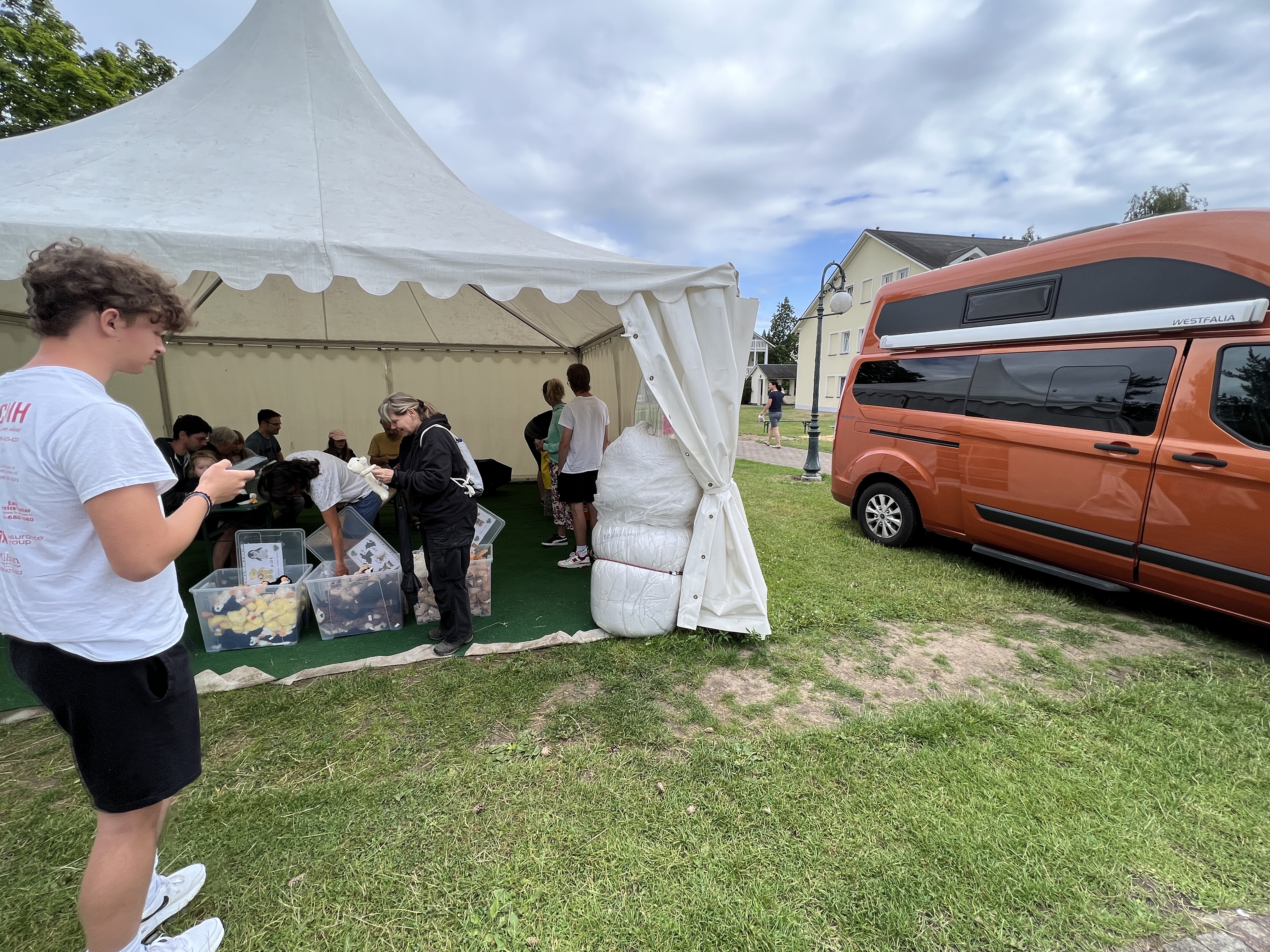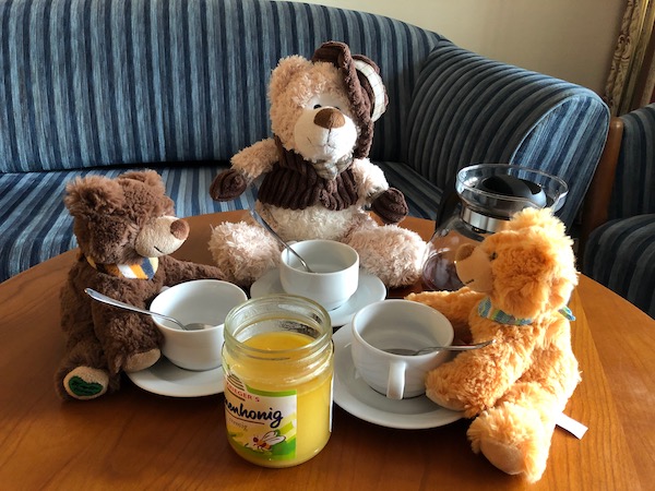 Anlässlich des Sommerurlaubes Zawanzich Dareiun'zawanzich weilt'n große Teile der Hüjelbesatzung off dor Ins'l Rüg'n. Dor unvermeidliche Besuch im Zelt dor Bärenmanufaktur Martin führte zur Adoption der Gebrüder Brumm. Wilhelm (links) und Jacob (rechts) behaupten u.a., in die Entdeckung der Merseburger Zaub-BÄR-Schprüche involviert zu sein. Wer's glaubt ...